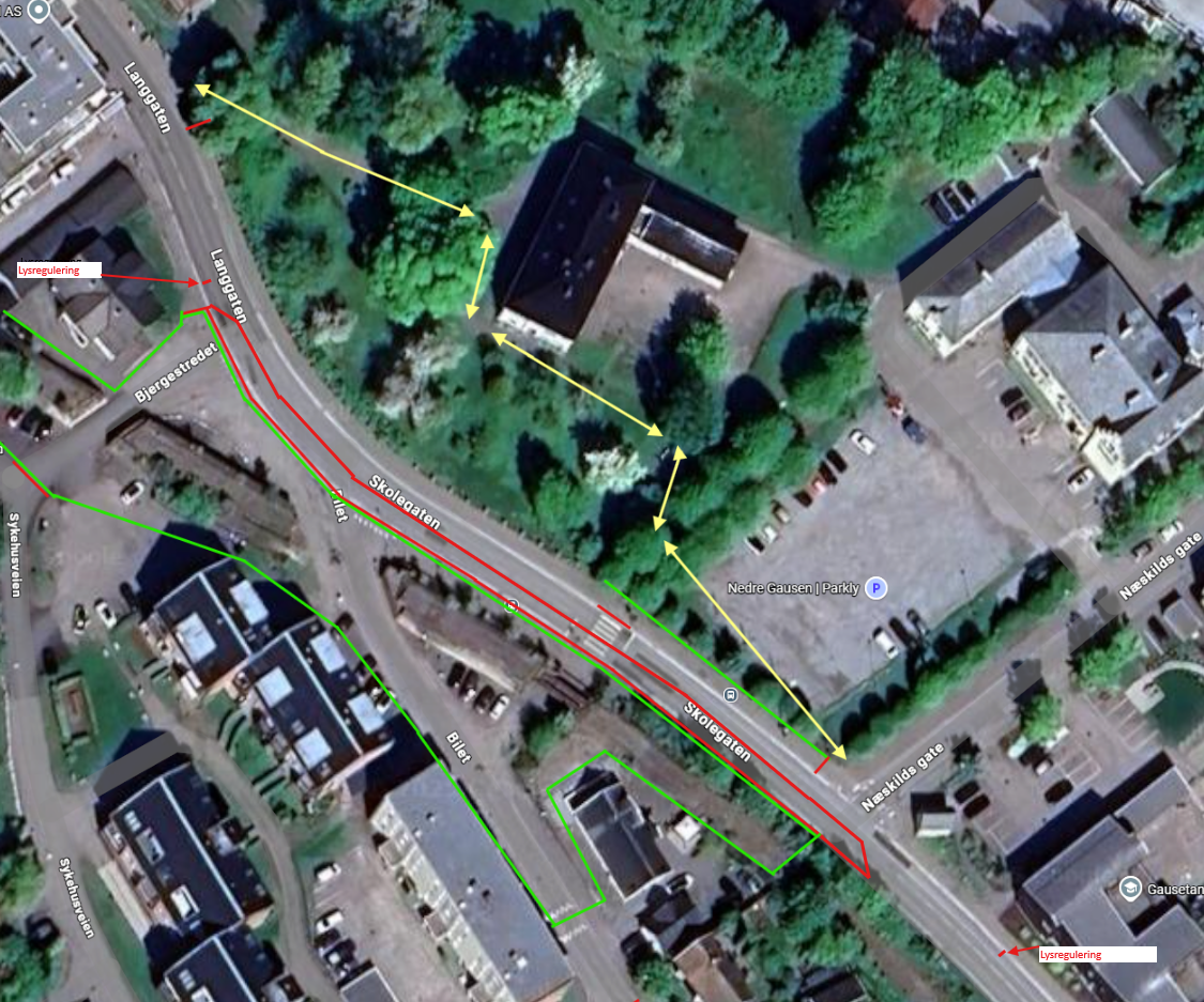 Fortauene på begge sider av Langgaten og Skolegaten mellom Næskilds gate og Langgaten 52 vil være helt stengt for myke trafikanter en stund fremover. I denne perioden legges det til rette for gående og syklende inne på selve eiendommen til Nedre Gausen gård (Skolegaten 1), som vist på illustrasjonen.